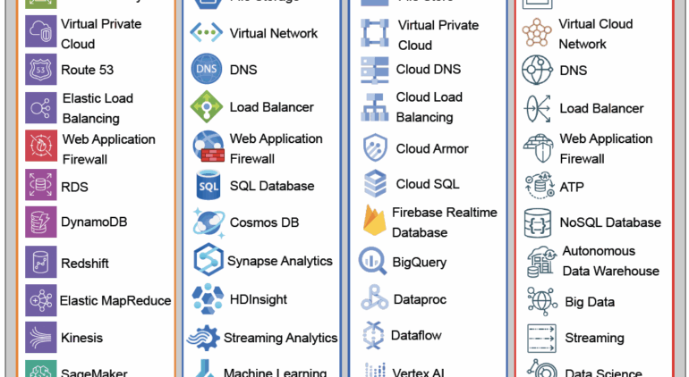 Comparison table of cloud services between AWS, GCP, and Azure. (Source: Softjourn, Public Domain)