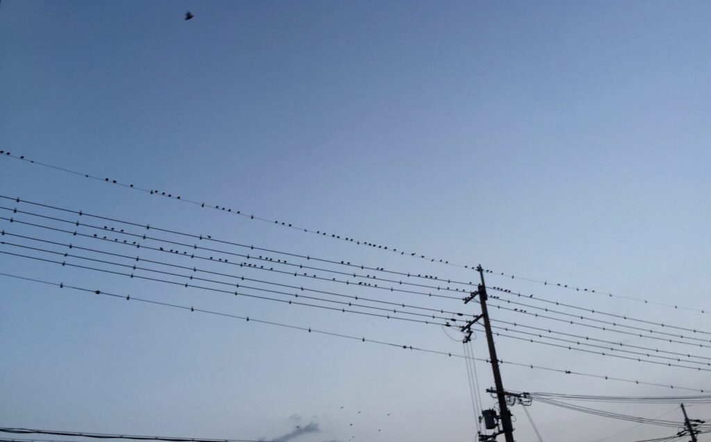ある日ある時の電柱。めっちゃ鳥が留まって…