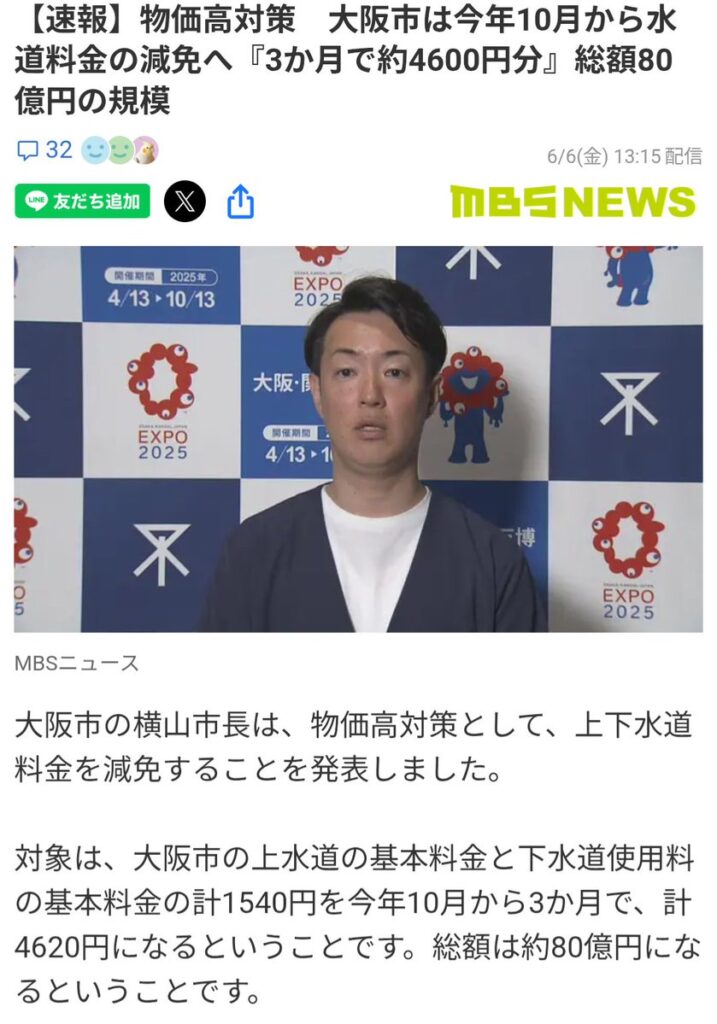 大阪市、水道基本料金3ヶ月免除で物価高対策推進
