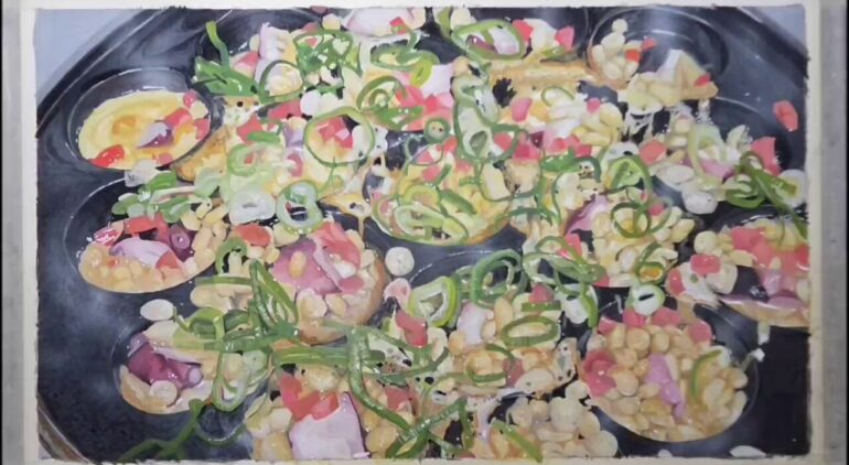 山田氏の技法は、ポスターカラーを用いた層状塗り重ねが鍵です。なぜこの方法か? それは、水彩のような透明感と油彩の厚みを両立し、食の立体感を表現できるからです。動画では、たこ焼き器を紙上で再現し、生地を流す工程から焼き色がつくまでを段階的に描きます。